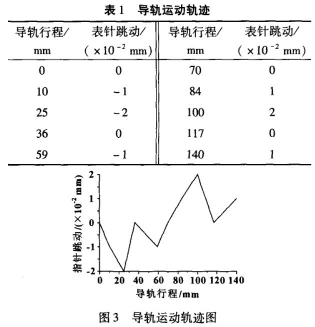 依據(jù)表頭指針的的讀數(shù),導軌在豎直面內(nèi)直線度較好,偏差僅有5μm,但在水平面內(nèi)有來回擺動的趨勢。相比較而言,誤差在水平面比較敏感。試驗中導軌從一極限位置開始,運動140 mm,導軌在水平面內(nèi)的運動軌跡如表1和圖3所示。