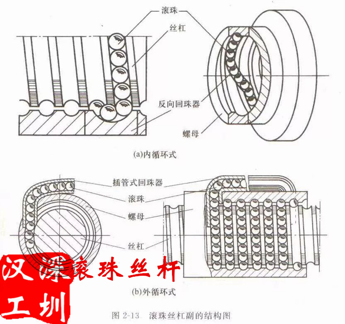 外循環(huán)滾珠絲杠螺母副按滾珠循環(huán)時的返回方式主要有端蓋式、插管式和螺旋槽式。 常用外循環(huán)方式:A端蓋式;B插管式; 端蓋式,在螺母上加工一縱向孔,作為滾珠的回程通道,螺母兩端的蓋板上開有滾珠的回程口,滾珠由此進入回程管,形成循環(huán)。插管式,它用彎管作為返回管道,這種結構工藝性好,但是由于管道突出螺母體外,徑向尺寸較大。螺旋槽式,它是在螺母外圓上銑出螺旋槽,槽的兩端鉆出通孔并與螺紋滾道相切,形成返回通道,這種結構比插管式結構徑向尺寸小,但制造較復雜。外循環(huán)滾珠絲杠外循環(huán)結構和制造工藝簡單,使用廣泛。其缺點是滾道接縫處很難做得平滑,影響滾珠滾道的平穩(wěn)性。